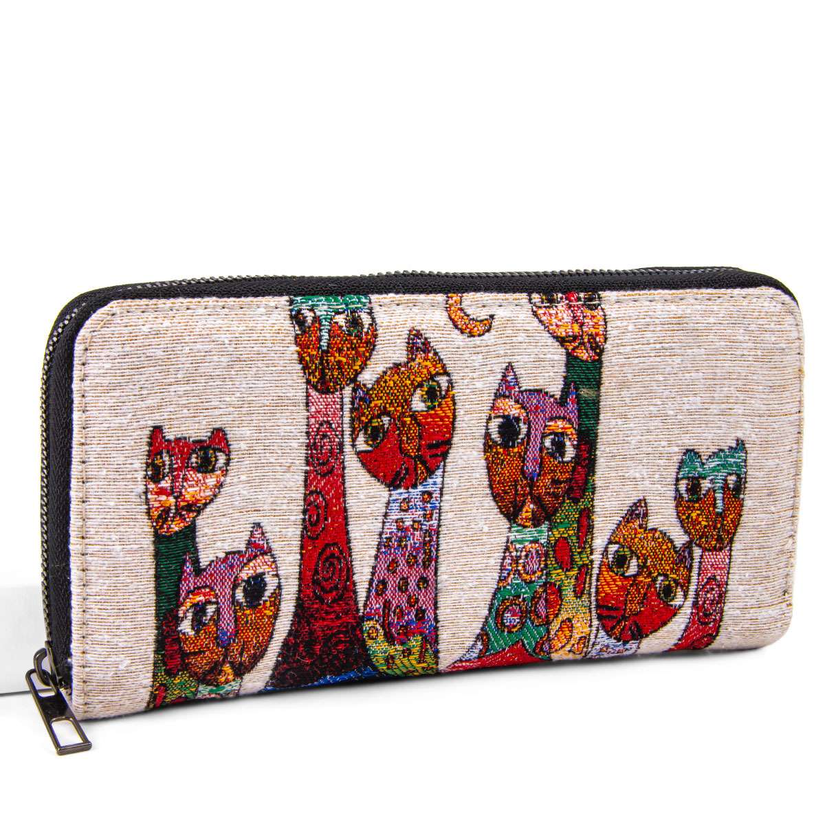 Diese große Geldbörse mit farbenfrohem Katzenmotiv ist ein praktischer Begleiter mit verspieltem Charme. Die gewebten, kunterbunten Katzenfiguren machen die Börse zu einem echten Blickfang – perfekt für alle, die Tiere lieben und individuelle Designs schätzen.