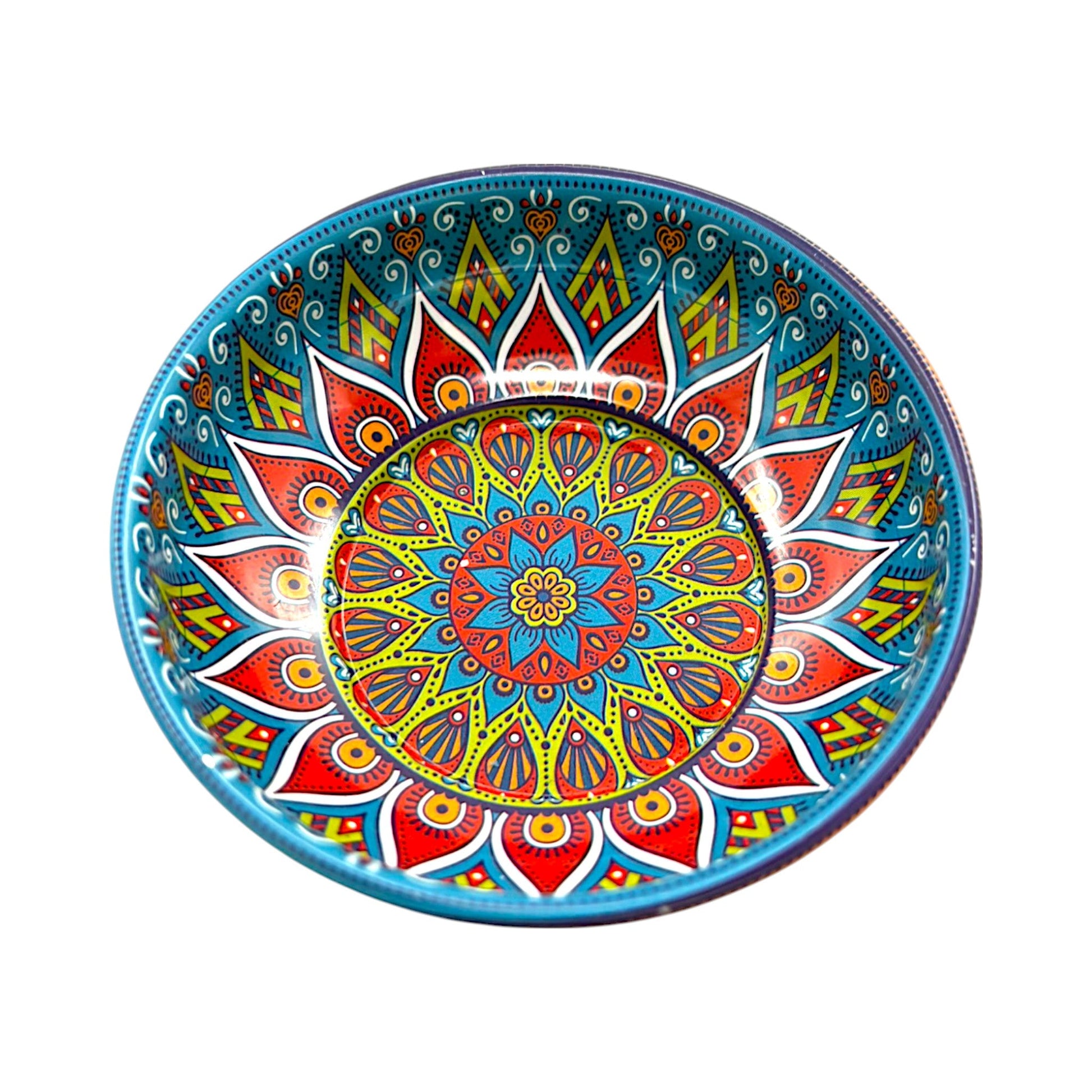 Bringe Farbe und orientalischen Charme in dein Zuhause! Diese stilvolle Blechschüssel im farbenfrohen Mandala-Design vereint Funktionalität und Design. Ob als Dekoschale, für Snacks oder als kleine Ablage – dieses Accessoire ist vielseitig einsetzbar und ein echter Blickfang.