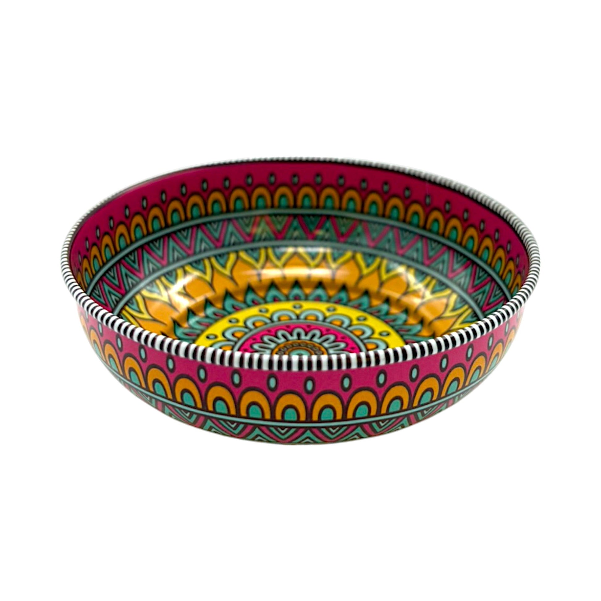 Bringe Farbe und orientalischen Charme in dein Zuhause! Diese stilvolle Blechschüssel im farbenfrohen Mandala-Design vereint Funktionalität und Design. Ob als Dekoschale, für Snacks oder als kleine Ablage – dieses Accessoire ist vielseitig einsetzbar und ein echter Blickfang.