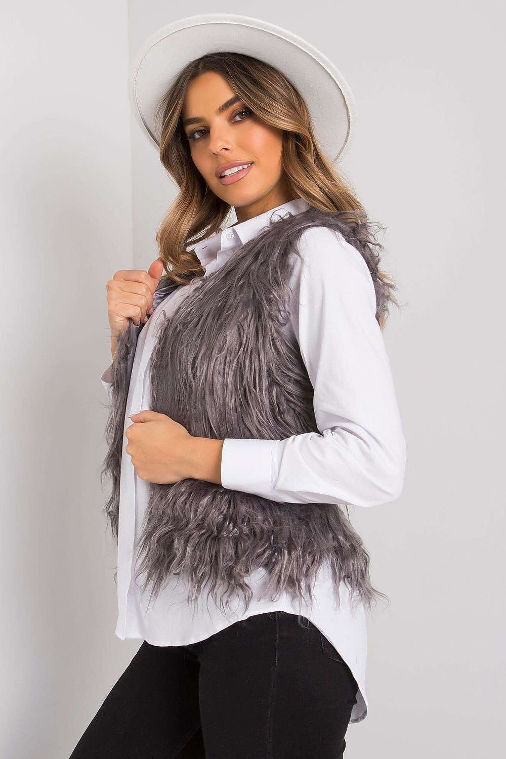 Beigefarbene Pelzweste mit Haken- und Ösenverschluss, vollständig gefüttert.